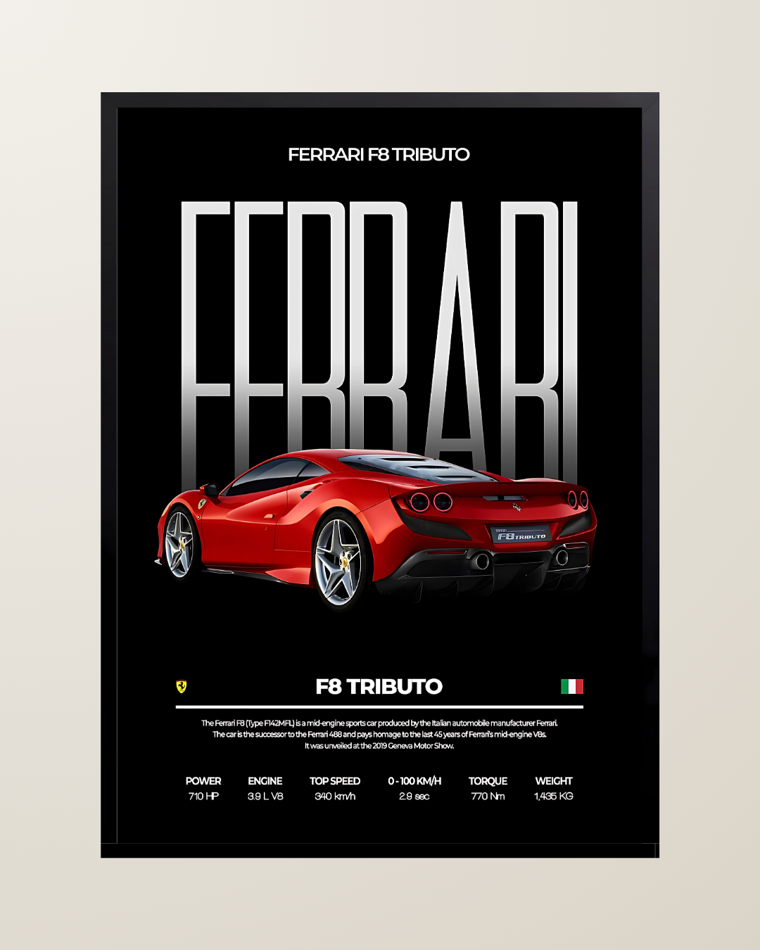Célébrez l’essence de la performance italienne avec ce tableau inspiré de la Ferrari F8 Tributo. Une œuvre d’art vibrante qui incarne vitesse, élégance et passion.